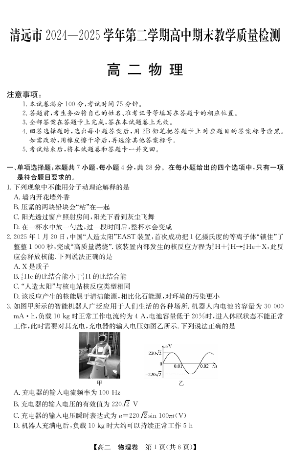 广东省清远市2024-2025学年第二学期高二期末教学质检物理