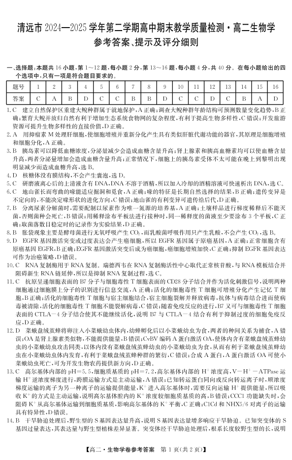 广东省清远市2024-2025学年第二学期高二期末教学质检生物答案