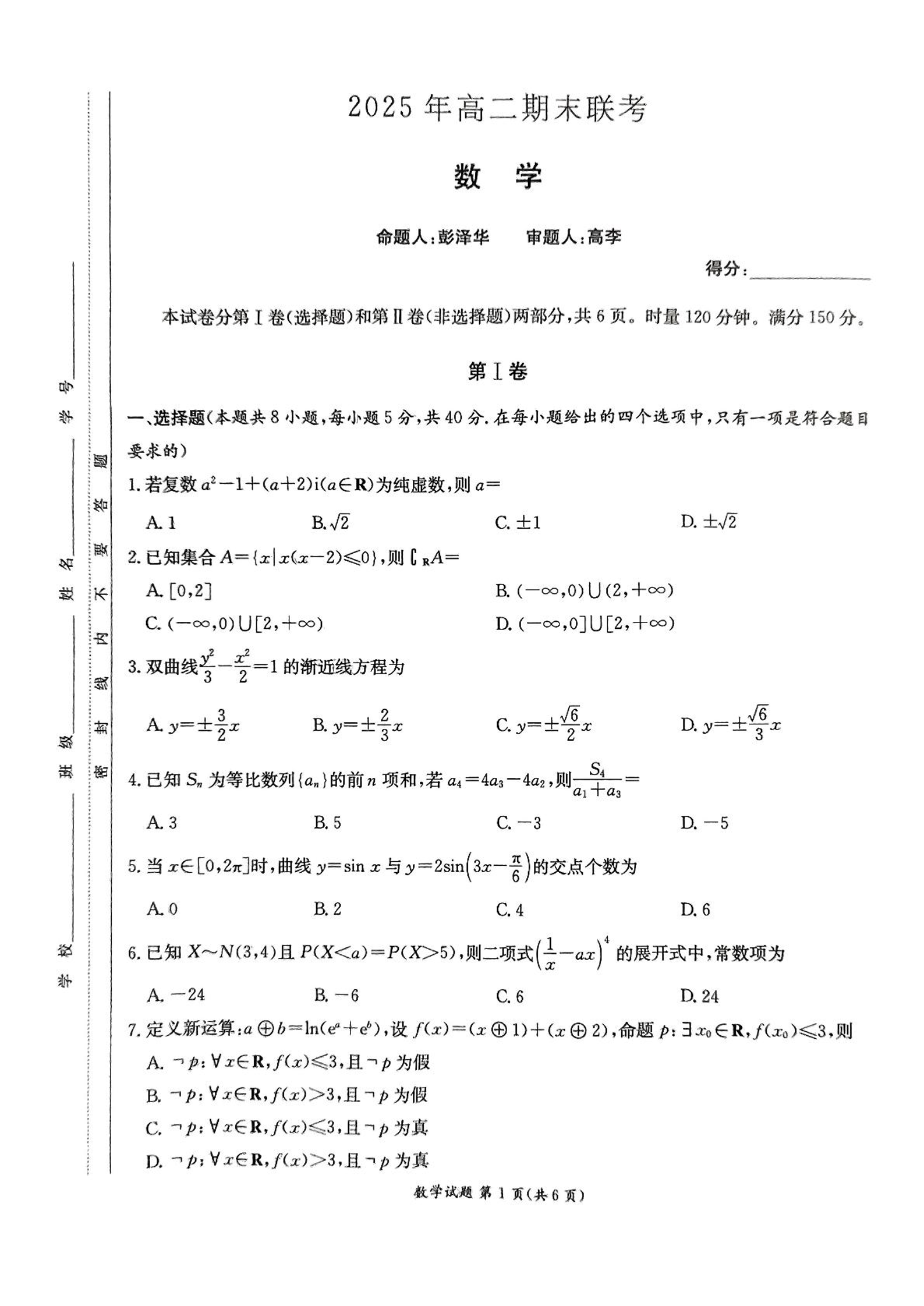 湖南新高考教学教研联盟暨长郡二十校联盟2025年高二年级下学期期末联考数学