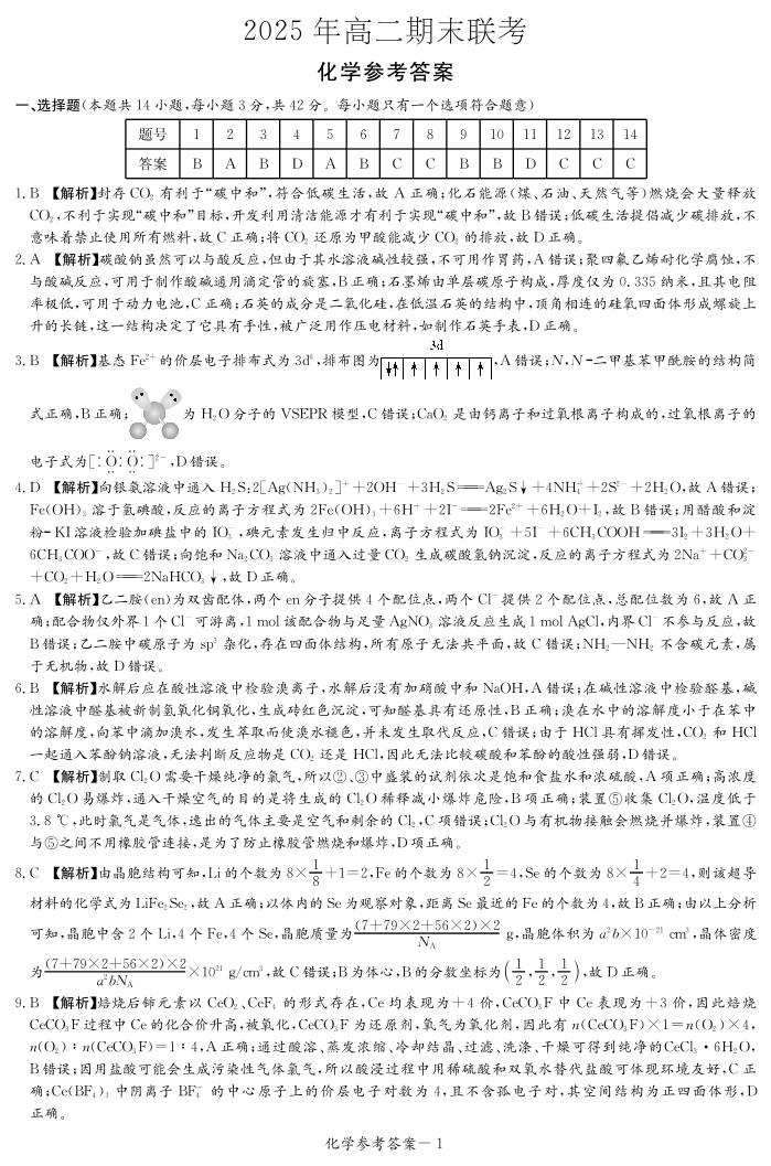 湖南新高考教学教研联盟暨长郡二十校联盟2025年高二年级下学期期末联考化学答案