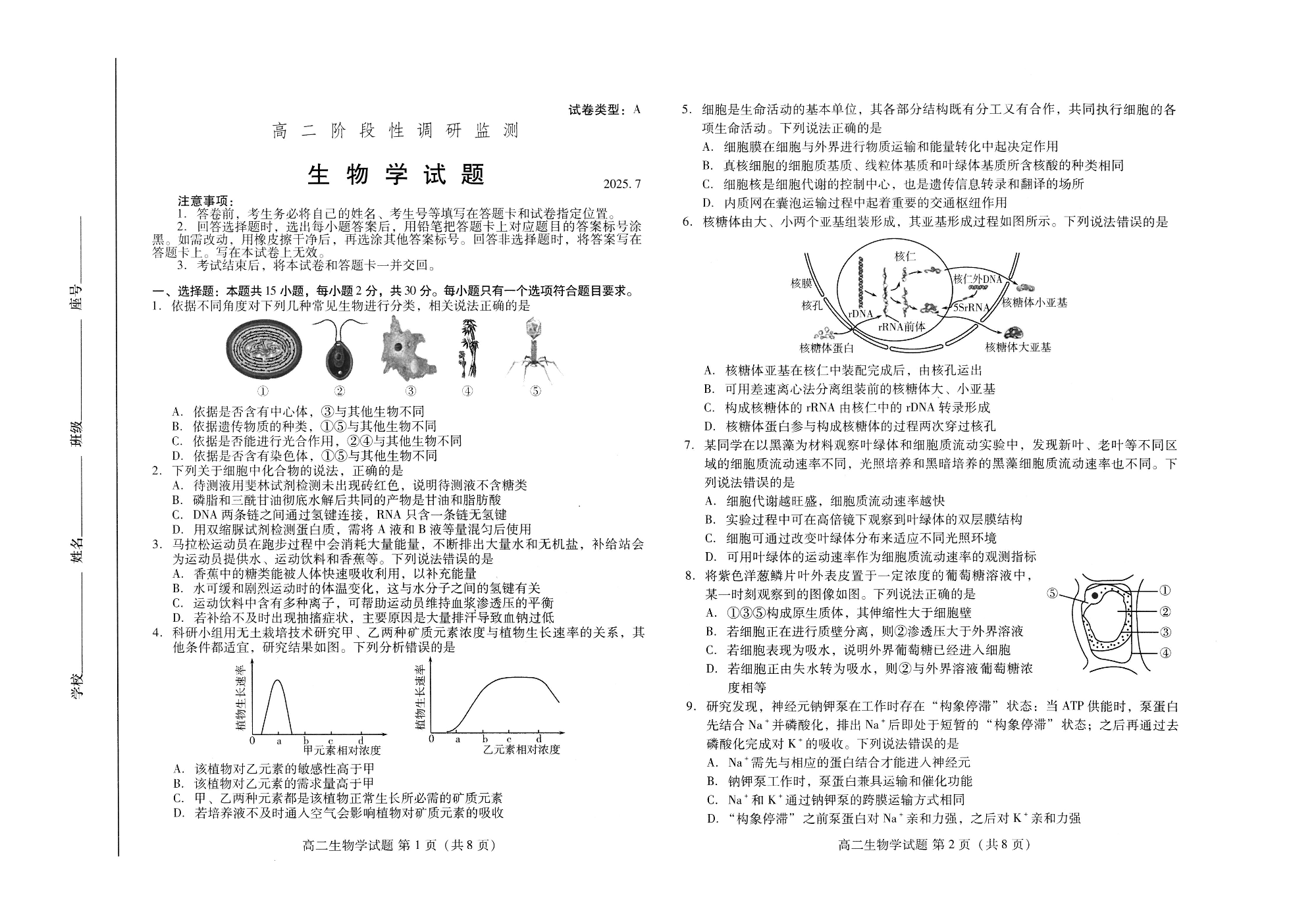 高二生物(山东省潍坊市2025.7阶段性调研监测)