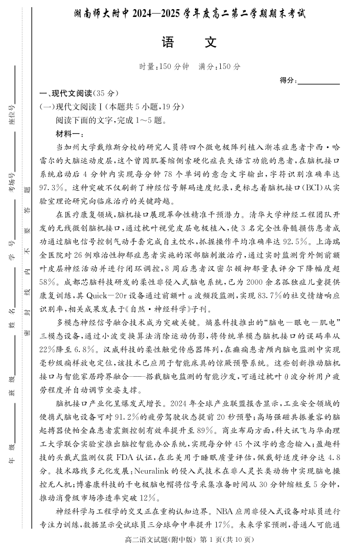 湖南省师范大学附属中学2024-2025学年高二下学期期末考试语文