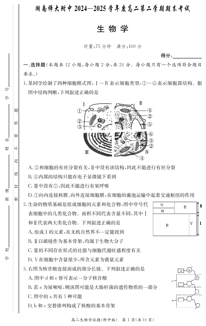 湖南省师范大学附属中学2024-2025学年高二下学期期末考试生物