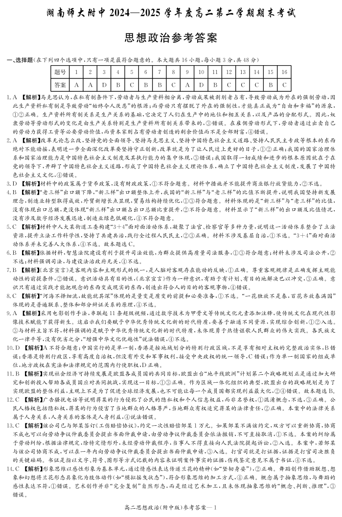 湖南省师范大学附属中学2024-2025学年高二下学期期末考试政治答案