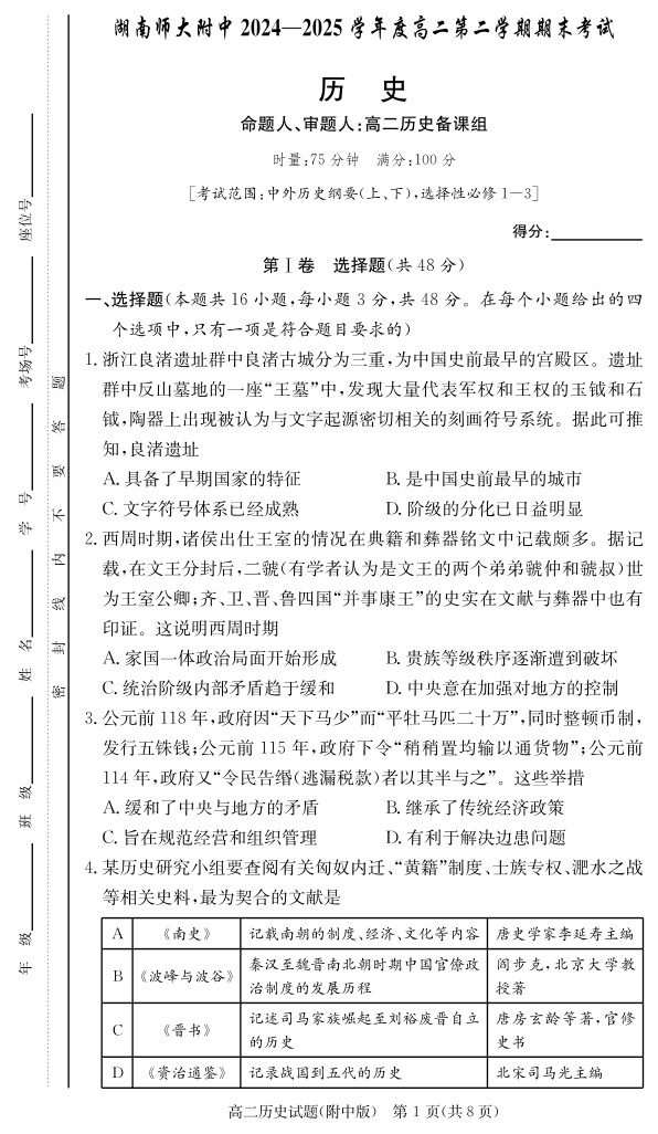湖南省师范大学附属中学2024-2025学年高二下学期期末考试历史