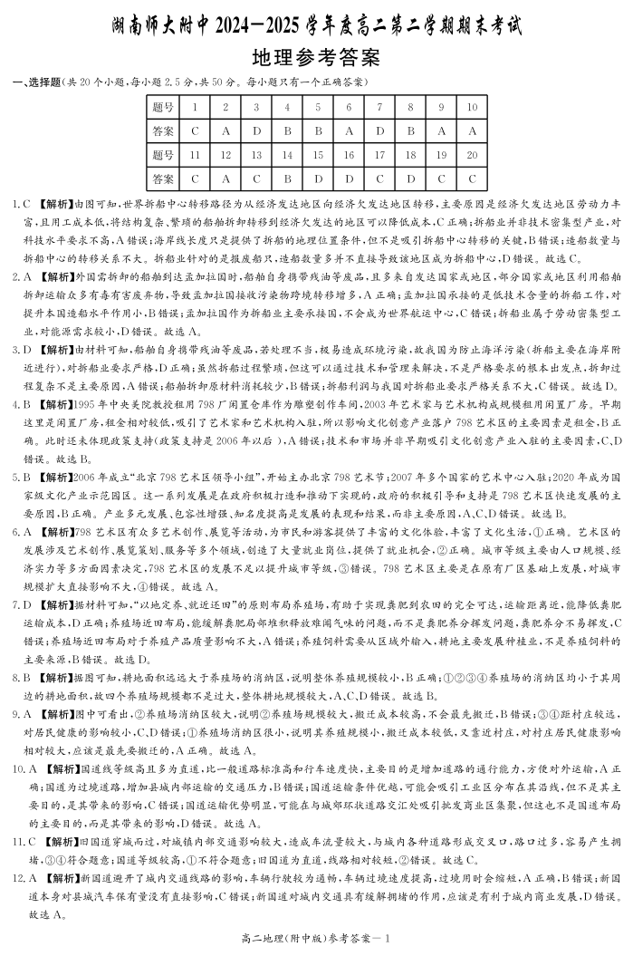 湖南省师范大学附属中学2024-2025学年高二下学期期末考试地理答案