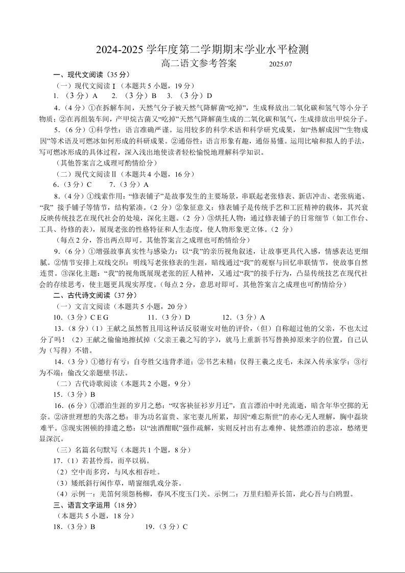 高二语文答案(山东省青岛区域2025.7高二期末检测)
