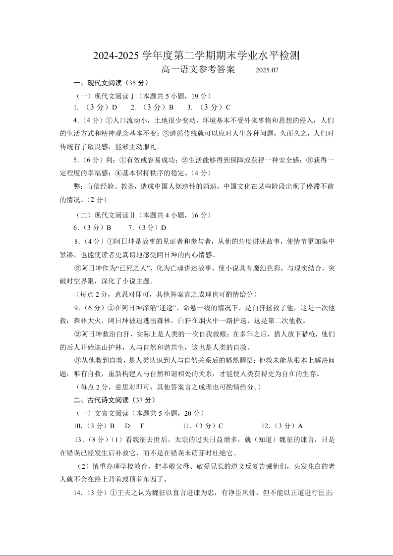高一语文答案(山东省青岛区域2025.7高一期末检测)