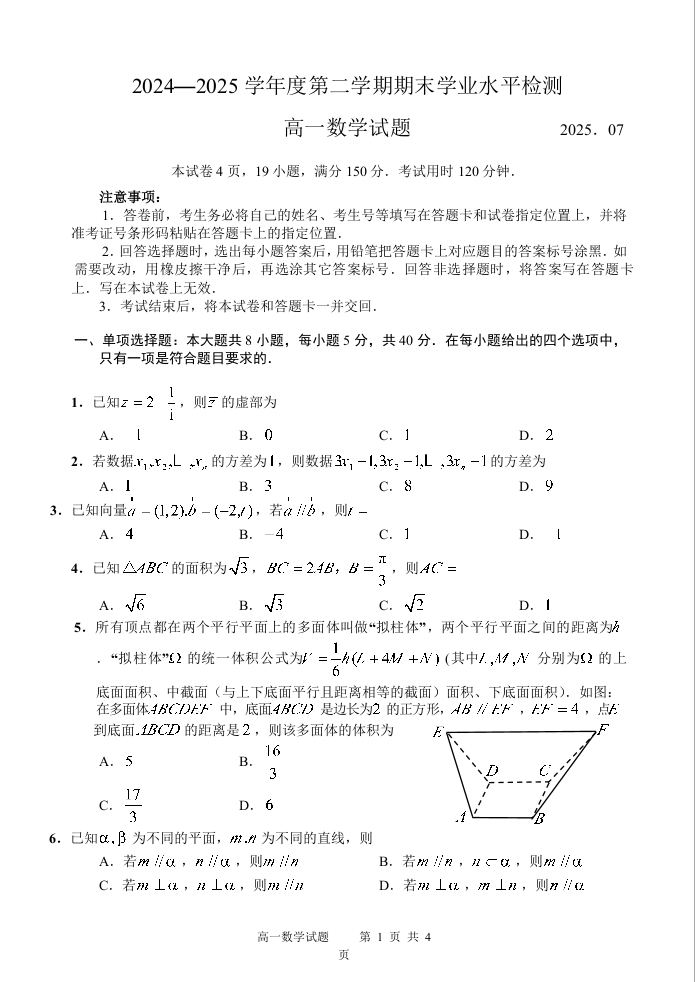 高一数学(山东省青岛区域2025.7高一期末检测)