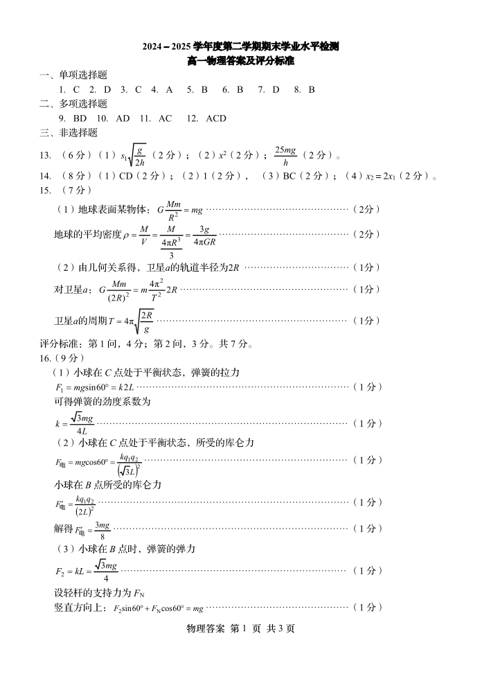 高一物理答案(山东省青岛区域2025.7高一期末检测)