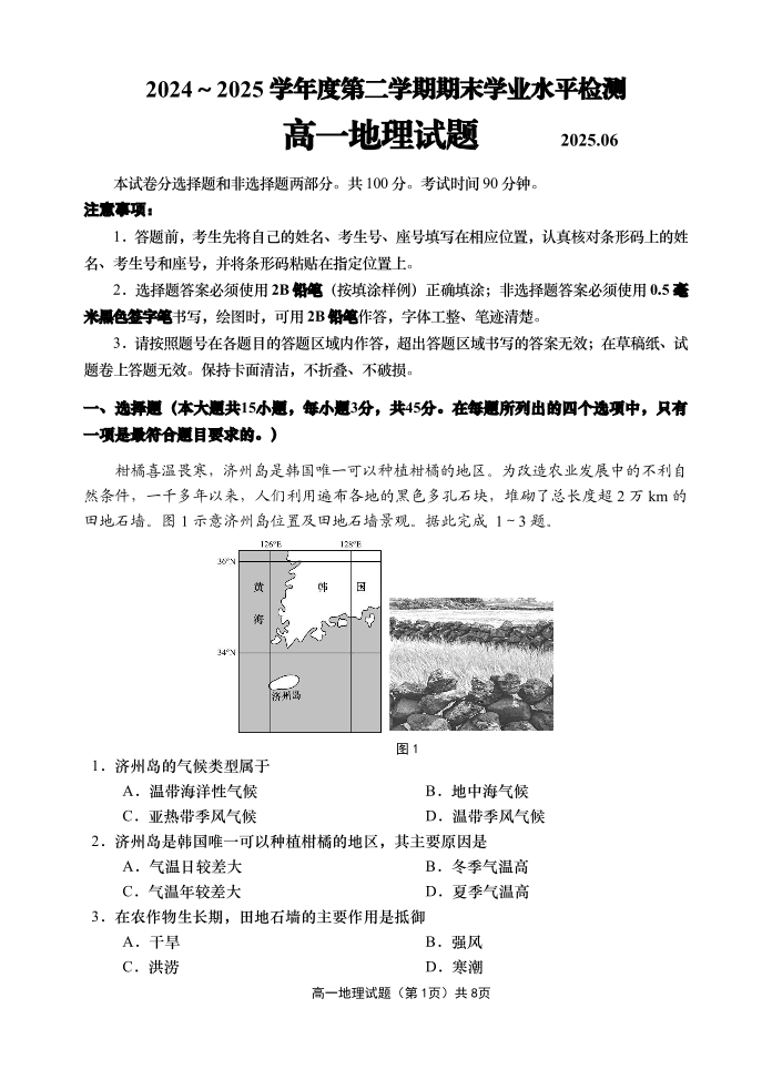 高一地理(山东省青岛区域2025.7高一期末检测)