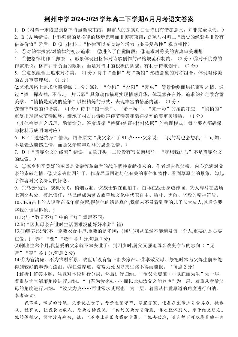 湖北省荆州中学2024-2025学年高二下学期6月月考试题语文答案