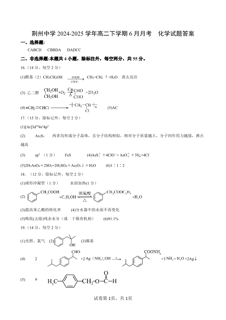 湖北省荆州中学2024-2025学年高二下学期6月月考试题化学答案