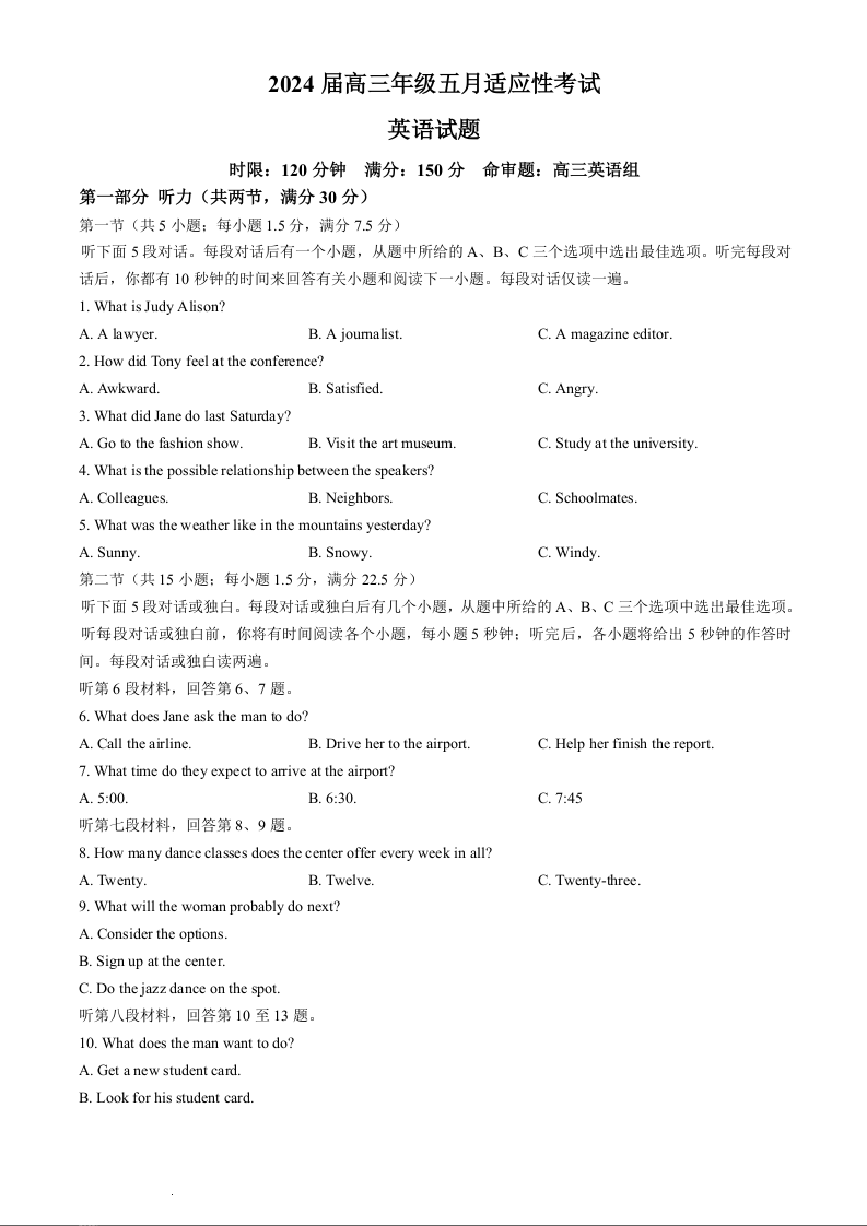 湖北省武汉市华中师范大学第一附属中学高三五月适应考英语+答案