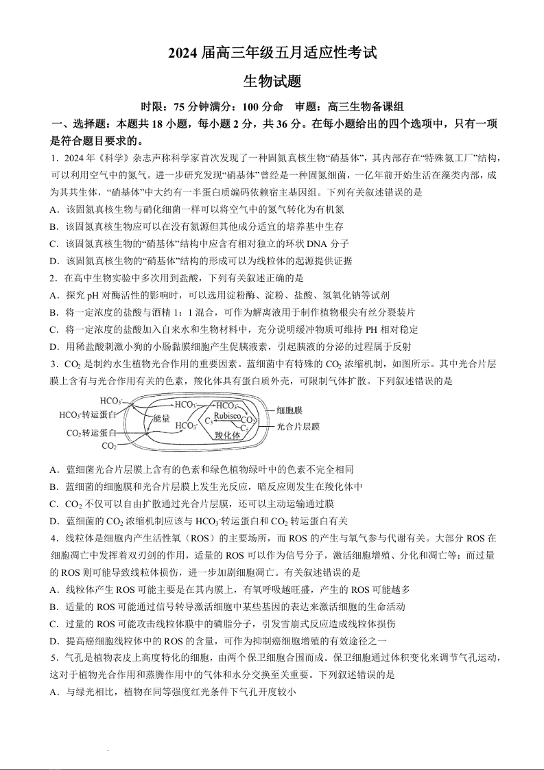 湖北省武汉市华中师范大学第一附属中学高三五月适应考生物+答案