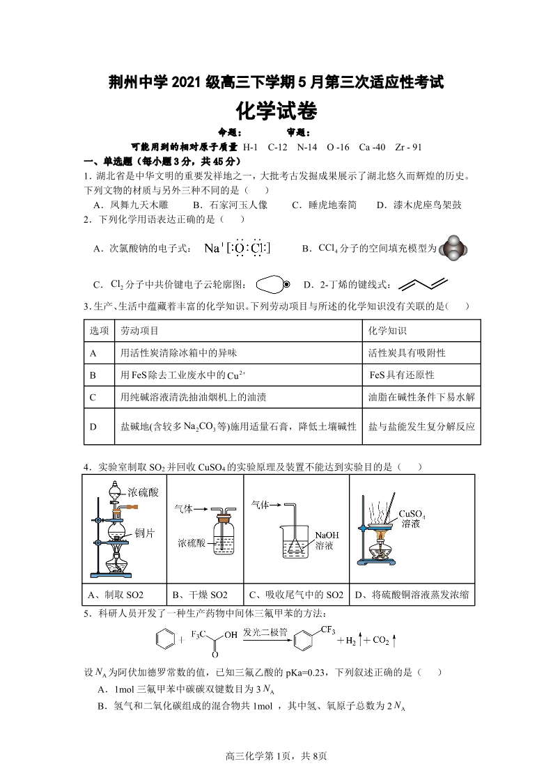 湖北省荆州中学2024届高三第三次适应考化学+答案
