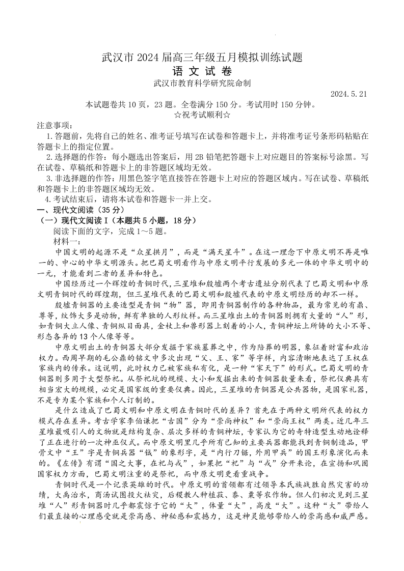 湖北省武汉市2024届高三下学期五月模拟训练语文+答案