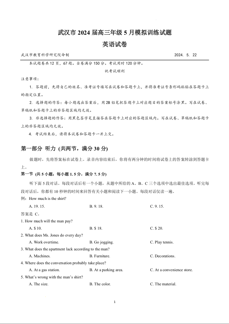 湖北省武汉市2024届高三下学期五月模拟训练英语+答案