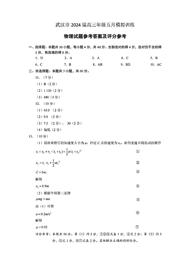 湖北省武汉市2024届高三下学期五月模拟训练物理答案