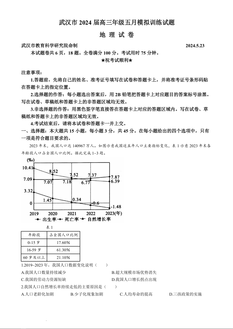 湖北省武汉市2024届高三下学期五月模拟训练地理