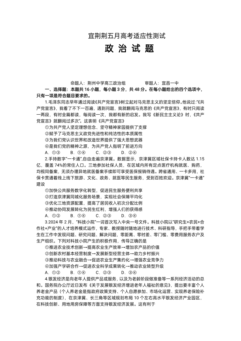 湖北省宜荆荆2024届高三下学期五月适应考政治