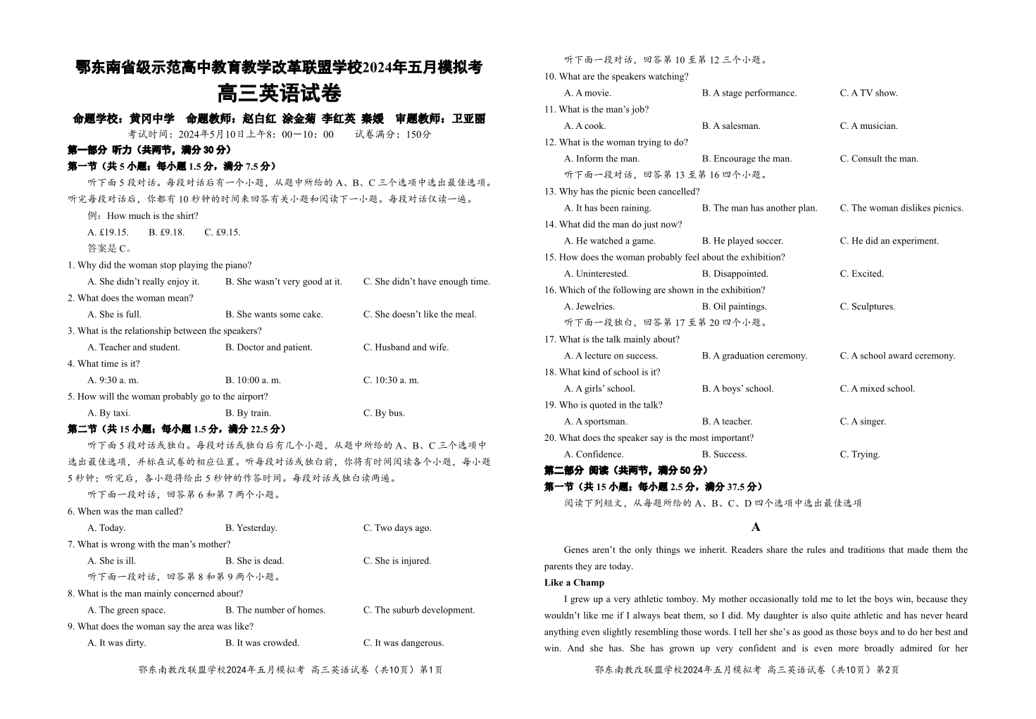湖北省鄂东南省级示范高中教育教学改革联盟 2024 年高三五月模拟考英语