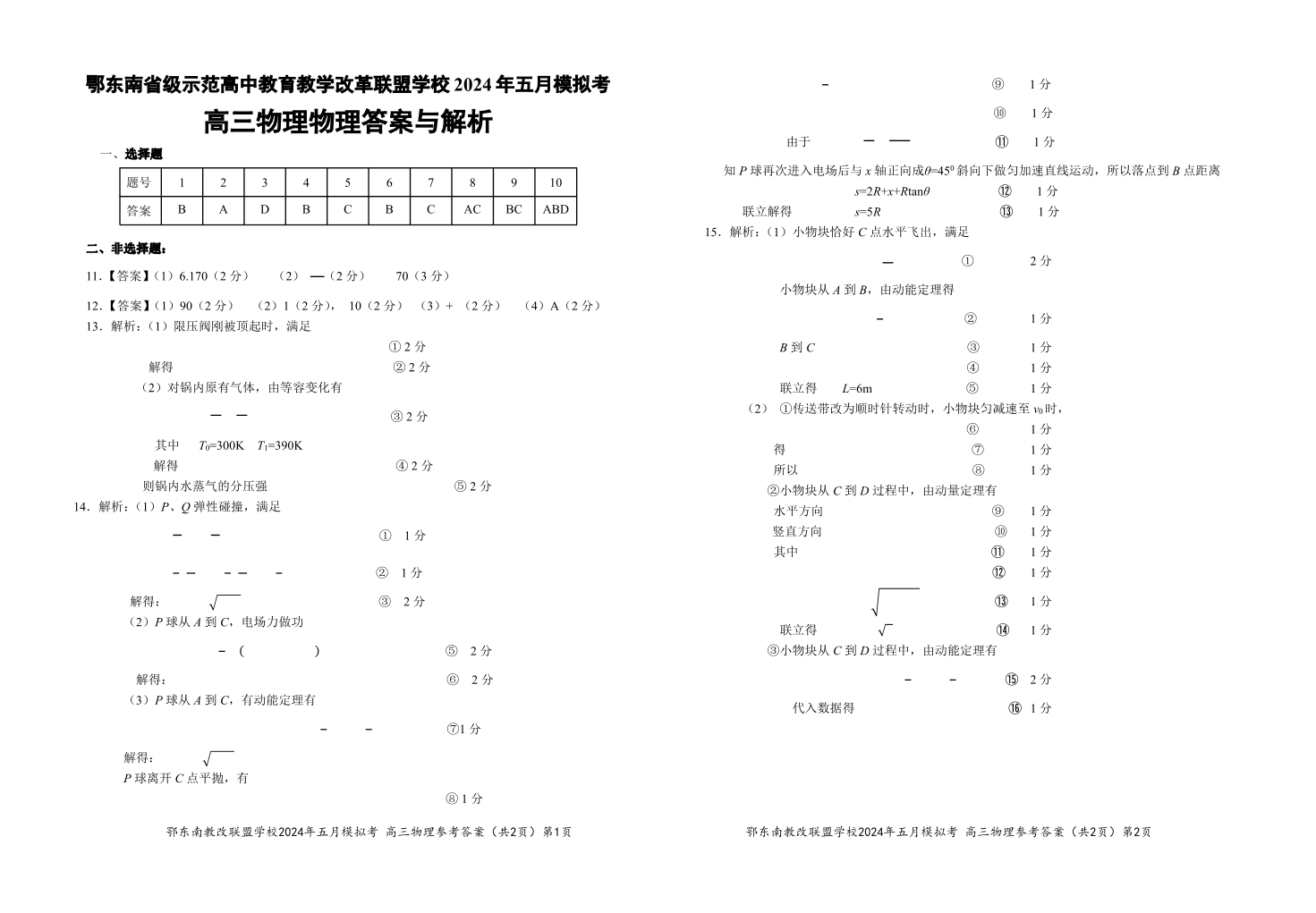 湖北省鄂东南省级示范高中教育教学改革联盟 2024 年高三五月模拟考物理答案