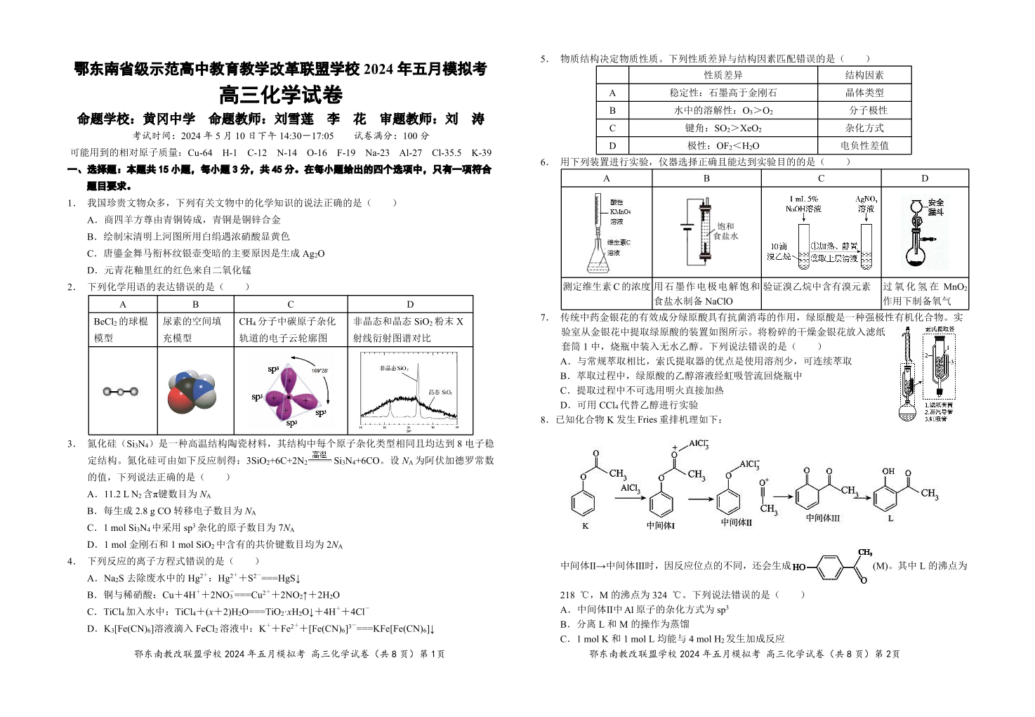 湖北省鄂东南省级示范高中教育教学改革联盟 2024 年高三五月模拟考化学