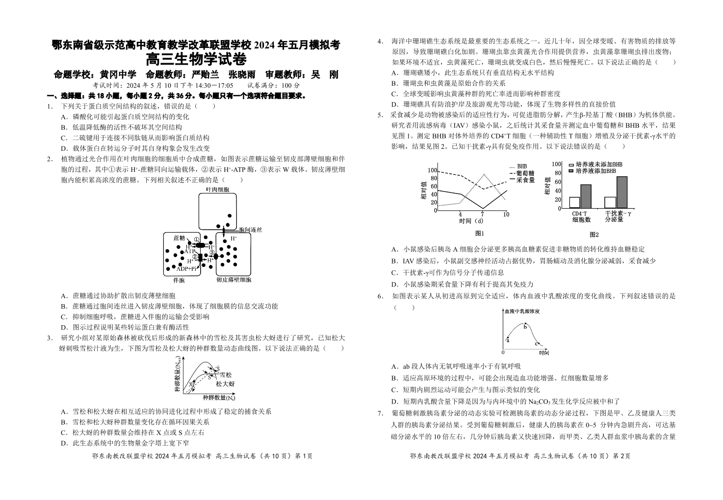 湖北省鄂东南省级示范高中教育教学改革联盟 2024 年高三五月模拟考生物