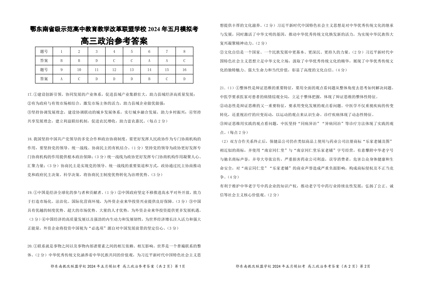 湖北省鄂东南省级示范高中教育教学改革联盟 2024 年高三五月模拟考政治答案
