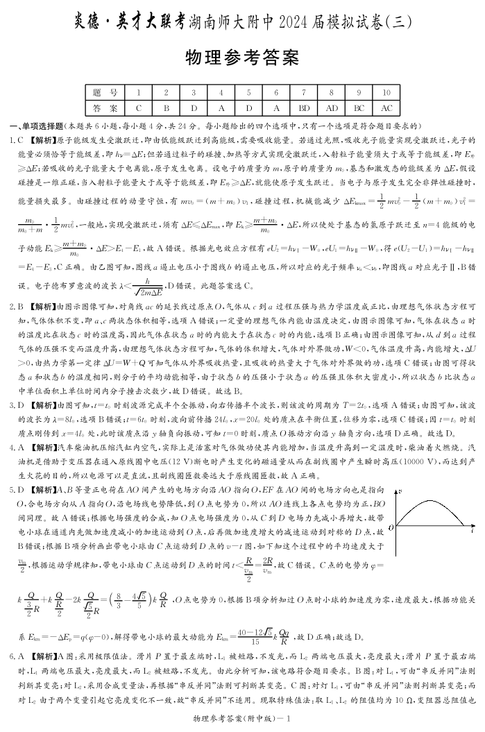 湖南省湖南师范大学附属中学2024届高三下学期模拟(三)物理答案