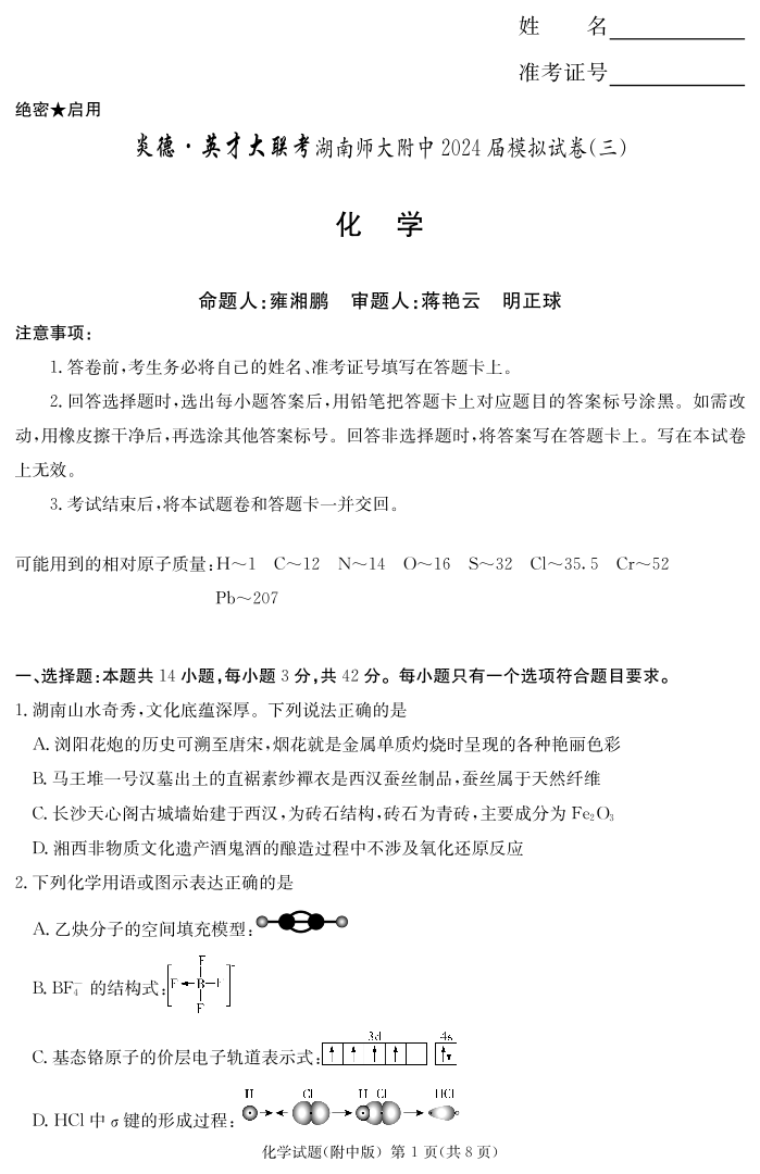 湖南省湖南师范大学附属中学2024届高三下学期模拟(三)化学(原卷版)