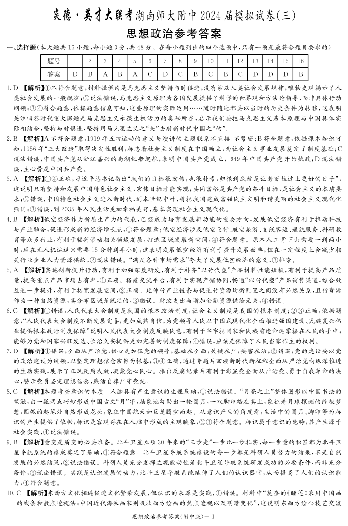 湖南省湖南师范大学附属中学2024届高三下学期模拟(三)政治答案