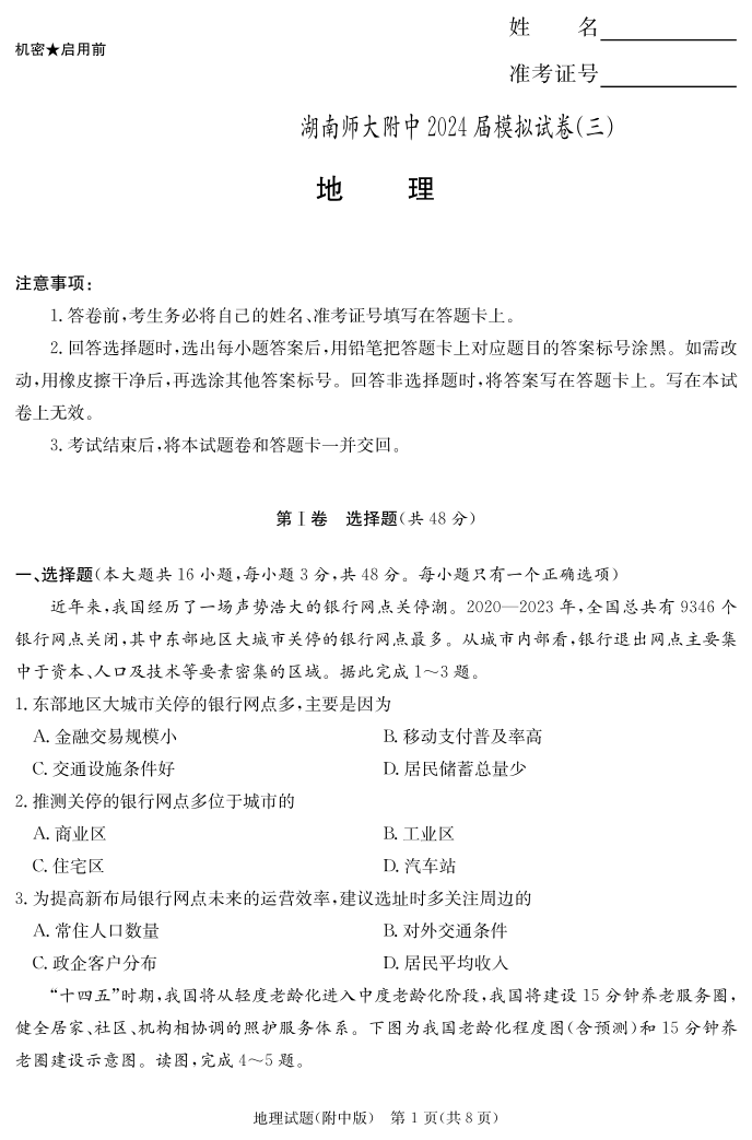 湖南省湖南师范大学附属中学2024届高三下学期模拟(三)地理