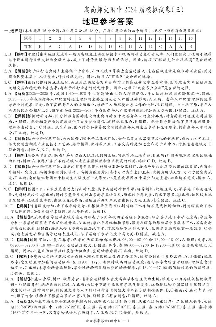 湖南省湖南师范大学附属中学2024届高三下学期模拟(三)地理答案
