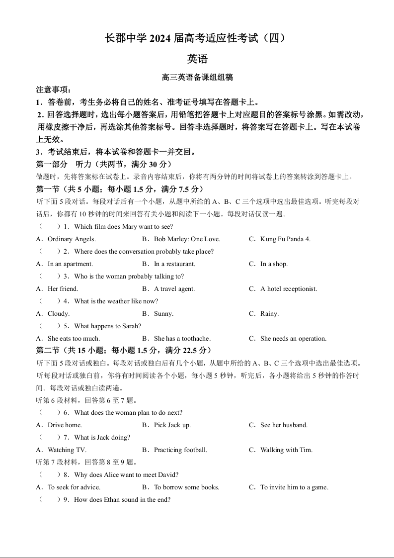 湖南省长郡中学2024届高三高考适应考试(四)英语+答案