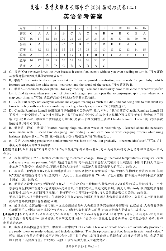 湖南省长郡中学2024届高三模拟考(二)英语答案