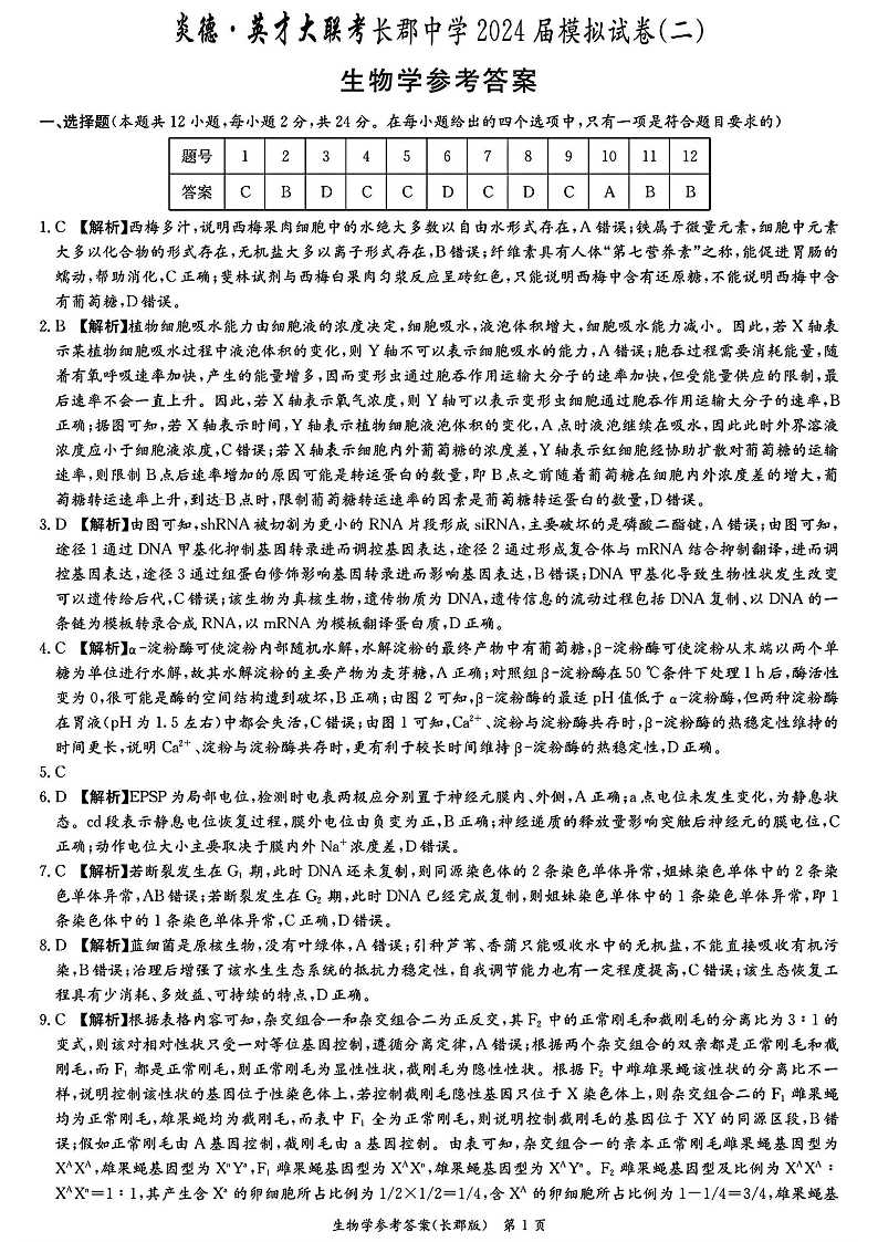 湖南省长郡中学2024届高三模拟考(二)生物答案