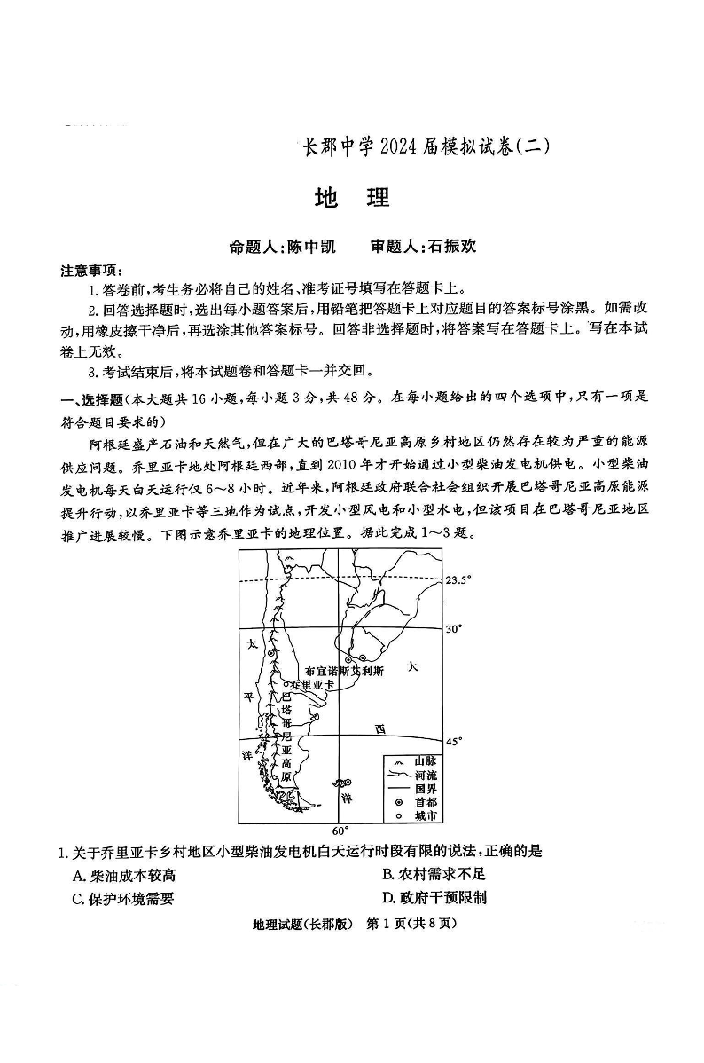 湖南省长郡中学2024届高三模拟考(二)地理+答案