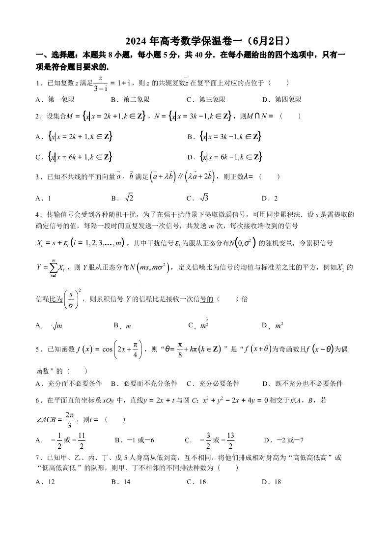 湖南省长郡中学2024届高三下学期6月保温测试数学+答案
