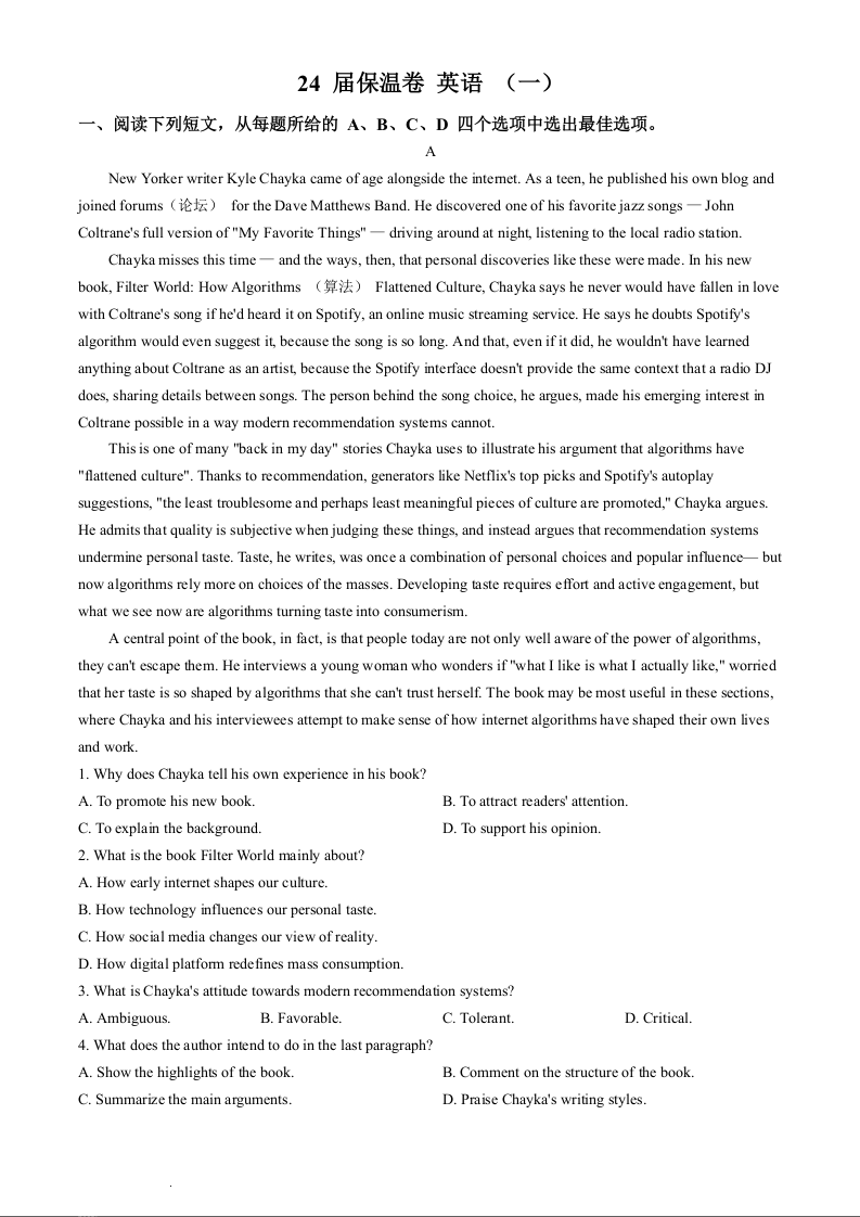 湖南省长郡中学2024届高三下学期6月保温测试英语+答案