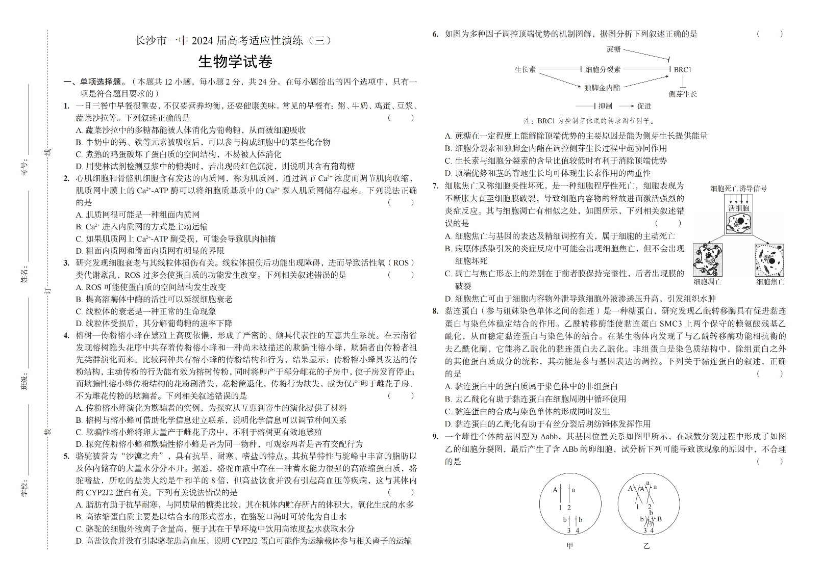湖南省长沙市第一中学2024届高考适应性演练(三)生物