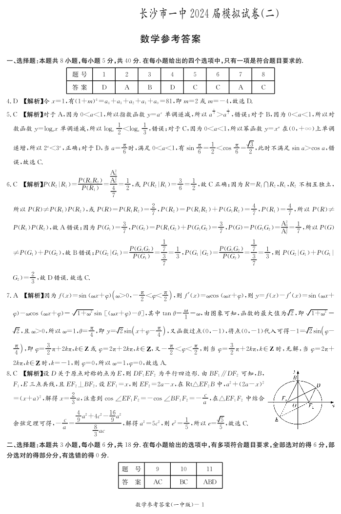 湖南省长沙市第一中学2024届高三模拟考试(二)数学答案