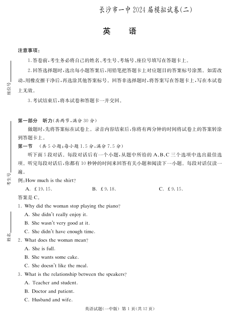 湖南省长沙市第一中学2024届高三模拟考试(二)英语