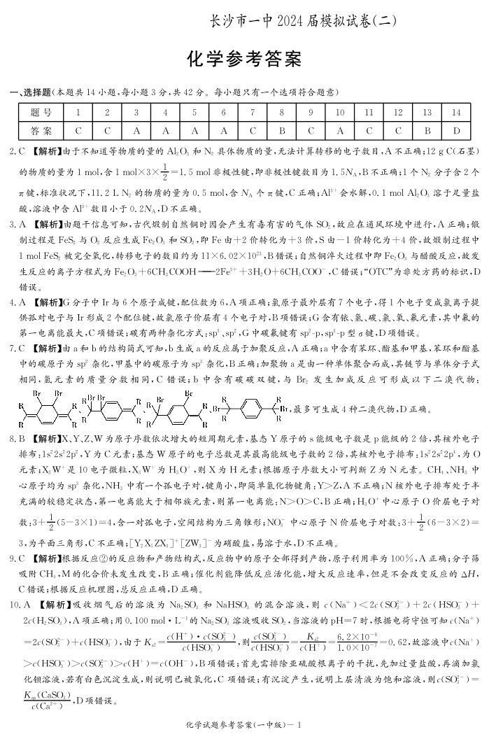 湖南省长沙市第一中学2024届高三模拟考试(二)化学答案