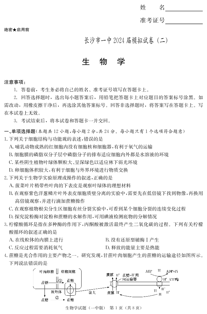 湖南省长沙市第一中学2024届高三模拟考试(二)生物