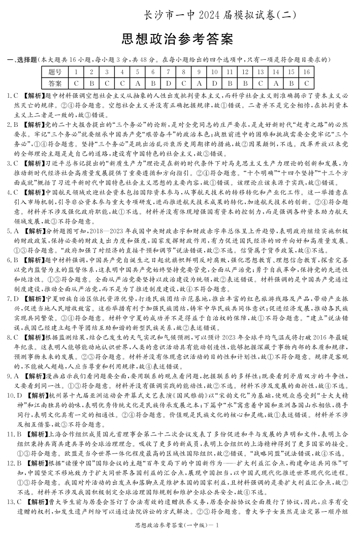 湖南省长沙市第一中学2024届高三模拟考试(二)政治答案