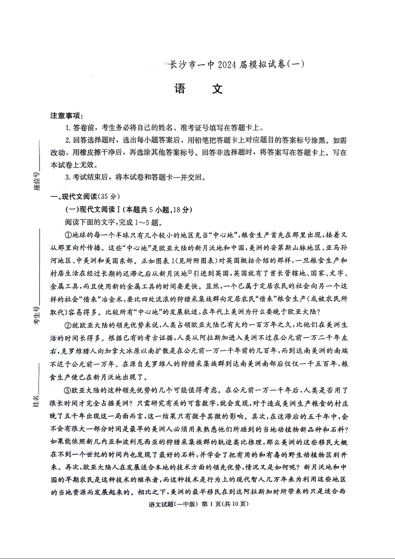 湖南省长沙市第一中学2024届高三模拟考试(一)语文