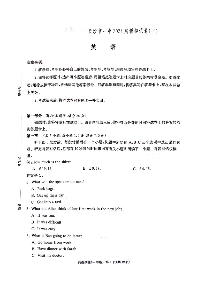湖南省长沙市第一中学2024届高三模拟考试(一)英语