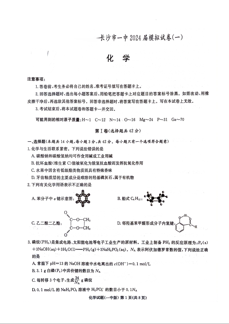 湖南省长沙市第一中学2024届高三模拟考试(一)化学
